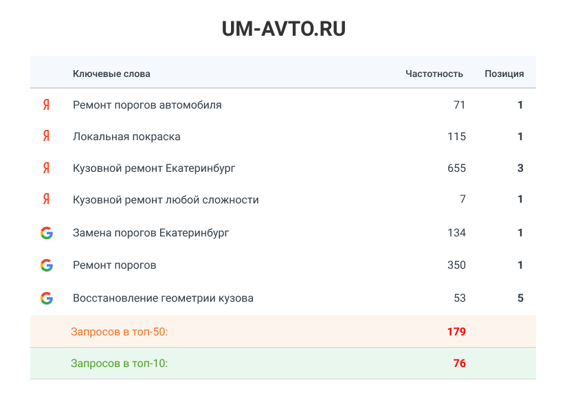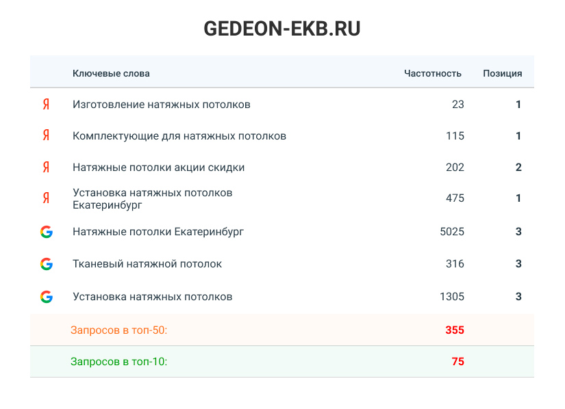 Многолетний опыт и профессионализм наших специалистов позволяют гарантировать выход сайта в ТОП-10 в течение полугода. Уже за 3 месяца работы ваш ресурс будет видно в ТОП-30 поисковых систем. Через 6 месяцев он будет уверенно занимать позиции в ТОП-10 поисковиков. А мы будем в дальнейшем помогать ему там удерживаться.